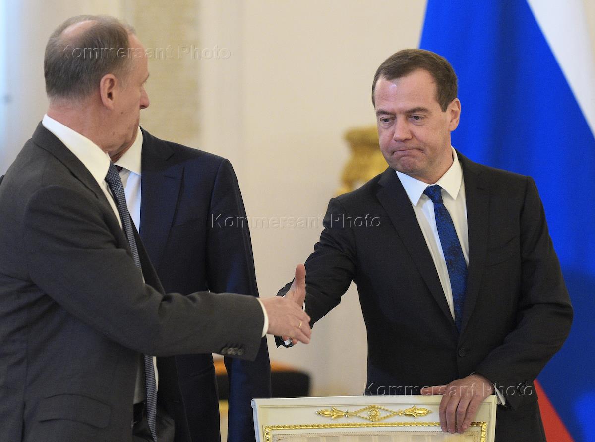Совместное заседание Государственного совета и комиссии по мониторингу достижения целевых показателей социально-экономического развития страны в Кремле. Председатель правительства России Дмитрий Медведев (справа) и секретарь Совета безопасности России Николай Патрушев (слева) перед началом заседания.