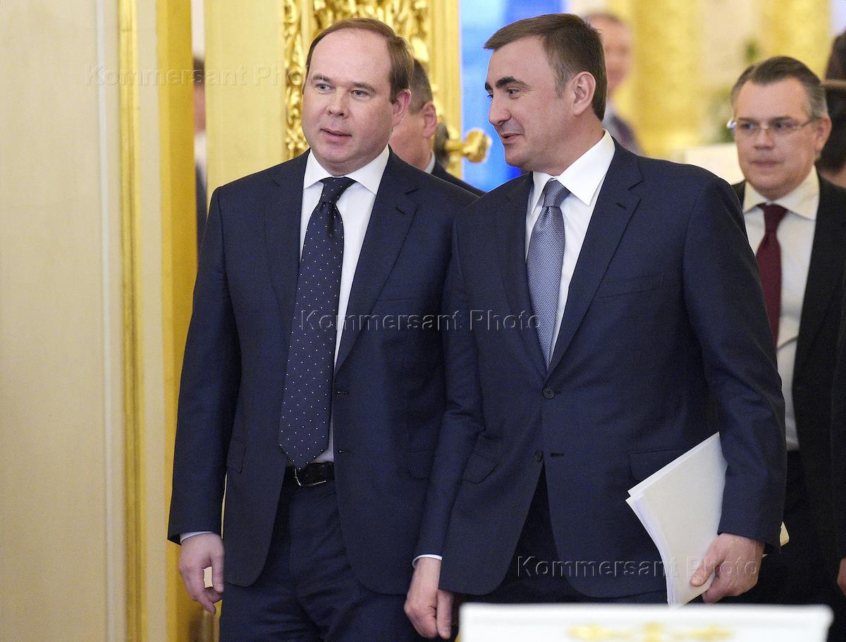 Заседание Государственного совета России и Комиссии по мониторингу достижения целевых показателей социально-экономического развития страны прошло в Кремле. Руководитель администрации президента России Антон Вайно(слева) и губернатор Тульской области Алексей Дюмин (справа) перед началом заседания.