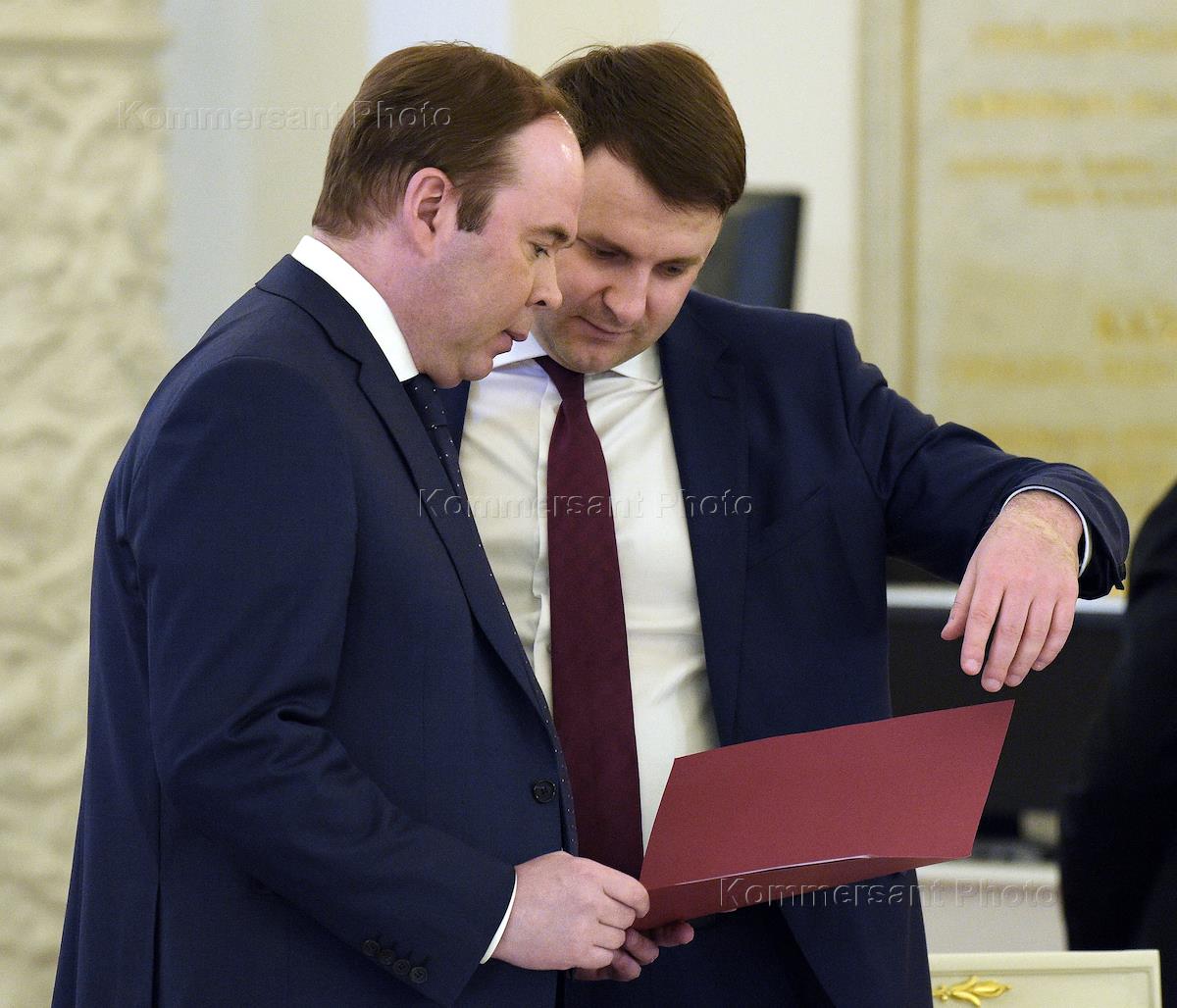 Совместное заседание Государственного совета и комиссии по мониторингу достижения целевых показателей социально-экономического развития страны в Кремле. Министр промышленности и торговли России Денис Мантуров (слева) и министр экономического развития России Максим Орешкин (справа) перед началом заседания.