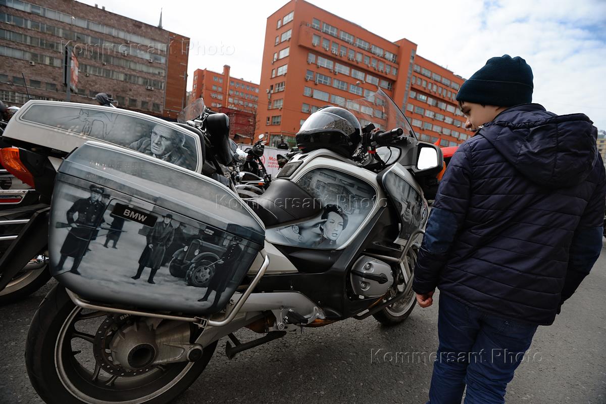 Мотопарад в поддержку развития мотокультуры и безопасности на дорогах в рамках фестиваля "Москва - город для мотоциклистов" прошел по Садовому кольцу. Малыш за рулем мотоцикла перед началом парада.