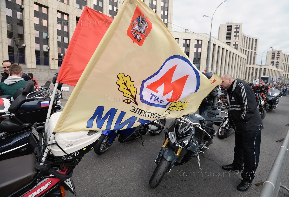 Мотопарад в поддержку развития мотокультуры и безопасности на дорогах в рамках фестиваля "Москва - город для мотоциклистов" прошел по Садовому кольцу. Участник с флагом России перед началом парада.