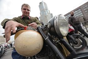 Мотопарад в поддержку развития мотокультуры и безопасности на дорогах в рамках фестиваля "Москва - город для мотоциклистов" прошел по Садовому кольцу. Участник в гимнастерке перед началом парада.