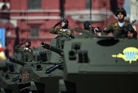 Генеральная репетиция военного парада, посвященного 72-й годовщине Победы в Великой Отечественной войне, на Красной площади. Военнослужащие на боевой машине десанта БМД-4 М "Садовница" (слева) и бронетранспортер БТР-МДМ "Ракушка" (справа) во время генеральной репетиции парада.