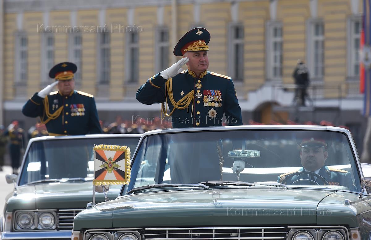 Мероприятия, посвященные 72-й годовщине Победы в Великой Отечественной войне, в Санкт-Петербурге. Военный парад прошел на Дворцовой площади. Командующий войсками Западного военного округа (ЗВО) Андрей Картаполов (справа) во время парада.