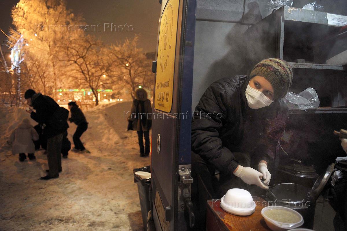 Волонтер во время раздачи еды из благотворительного "Ночного автобуса".
