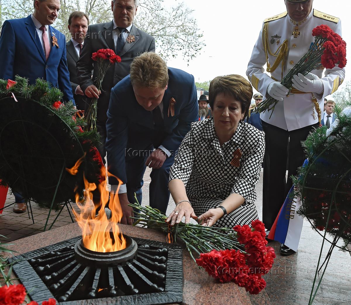 Мероприятия, посвященные 72-й годовщиня Дня Победы в Великой Отечественной войне. Зрители во время военного парада. Церемония возложения цветов к Мемориалу героической обороны Севастополя. Временно исполняющим обязанности губернатора Севастополя Дмитрий Овсянников (в центре) и председатель Законодательного собрания (ЗакС) Севастополя Екатерина Алтабаева (вторая справа) во время церемонии.