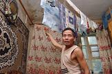 Жители аварийных домов в Алтайском крае. Мужчина азиатской внешности в жилой отсыревшей комнате под веревками с бельем.