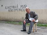 Жители аварийных домов в Алтайском крае. Мужчина сидит на табурете на дороге.