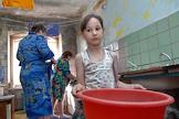 Жители аварийных домов в Алтайском крае. Девочка с тазом перед умыванием в общей кухне.