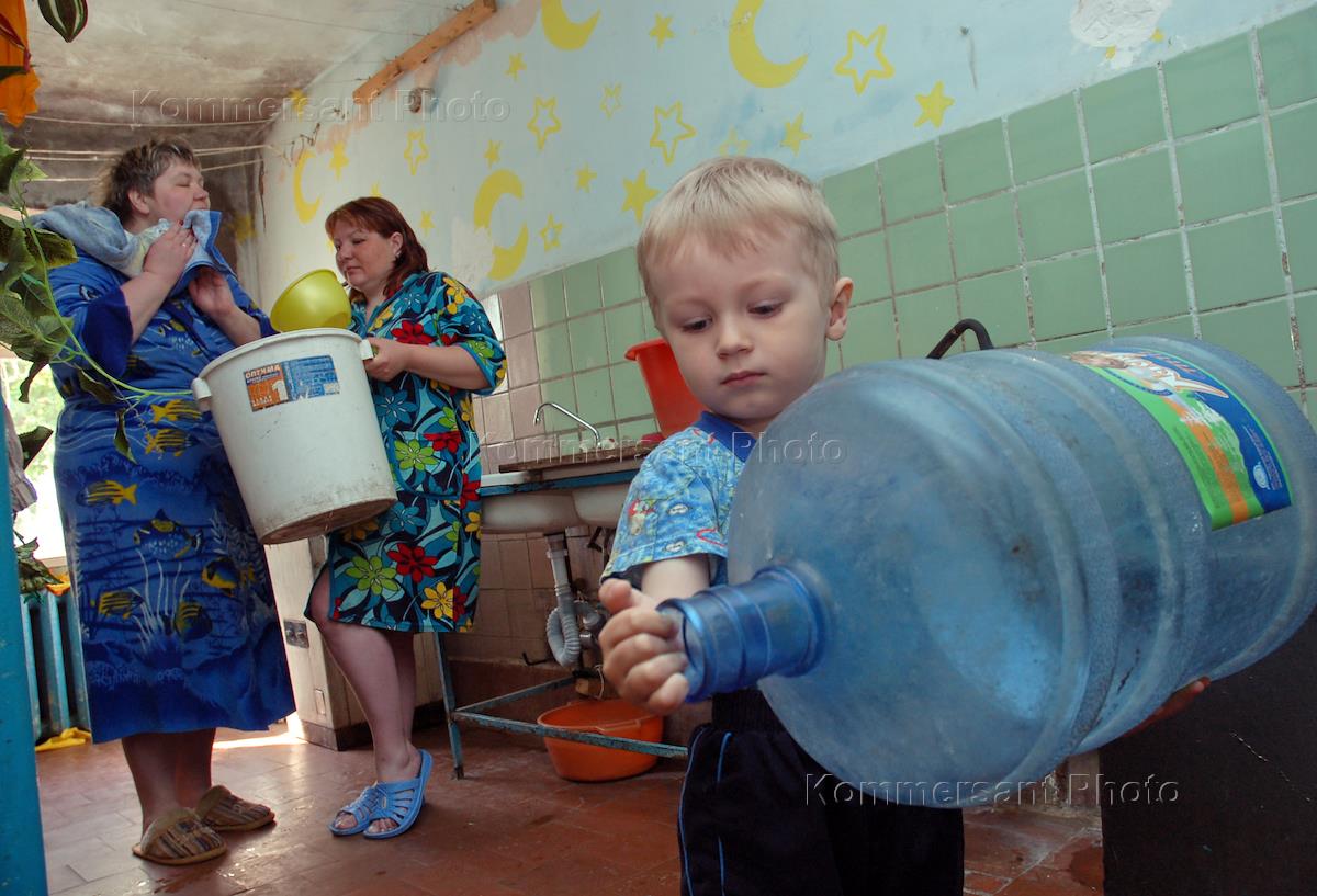 Жители аварийных домов в Алтайском крае. Женщины в общей кухне умываются из ведра, ребенок наливает воду из большой канистры