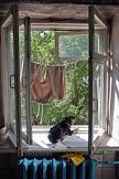 Жители аварийных домов в Алтайском крае. Дед с сигаретой в грязной комнате с полузанавешенным тряпкой окном.