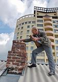 Жители аварийных домов в Алтайском крае. Мужчина во время ремонта кирпичной трубы на крыше старого дома на фоне новостройки.