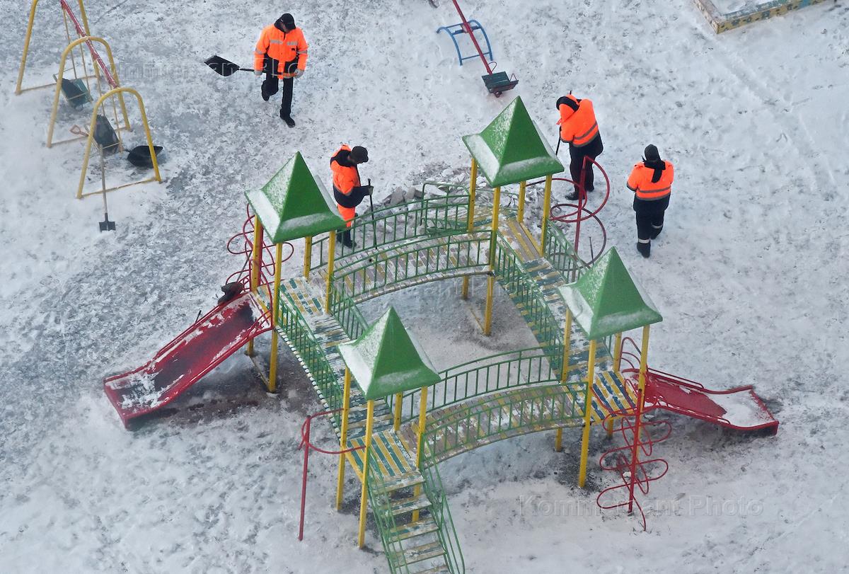 Виды города Одинцово. Дворники во время уборки территории на детской площадки.