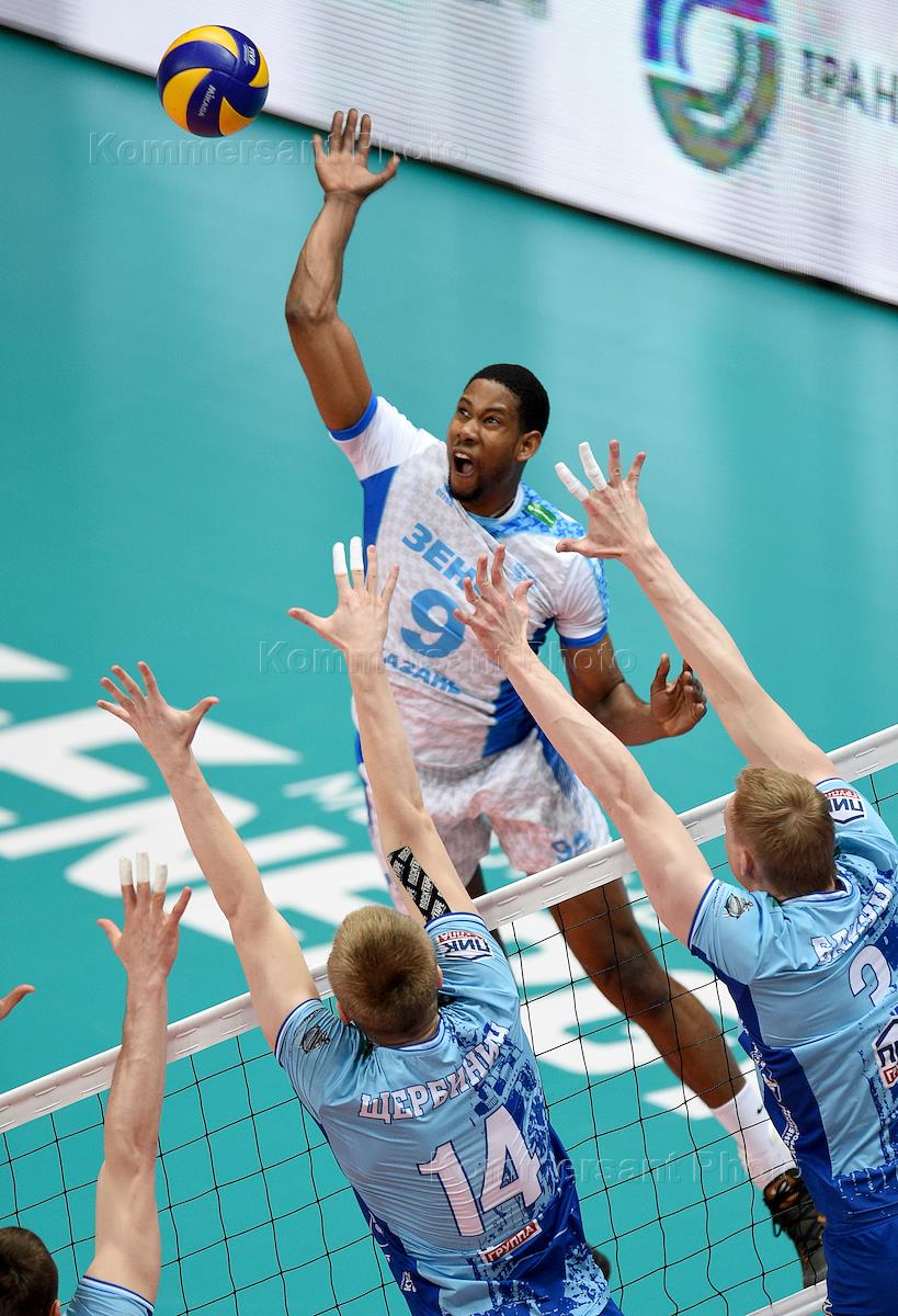 Чемпионат России по волейболу "Финал шести". Финал. Матч между командами "Динамо" (Москва) - "Зенит-Казань" (Казань) во Дворце спорта "Динамо". Игрок команды "Зенит" Денис Земченок (справа) во время матча.