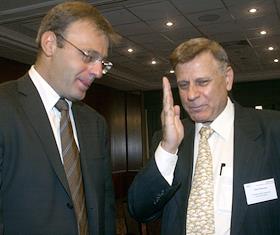 Член совета директоров "Альфа-банка" Олег Сысуев (слева) и генеральный директор СП General Motors - АВТОВАЗ Джон Милонас (справа) на церемонии подписания официальных договоров о сотрудничестве между General Motors - АВТОВАЗ - Собинбанком и Альфа-Банком. Подписание прошло в отеле "Рэдиссон-Славянская".