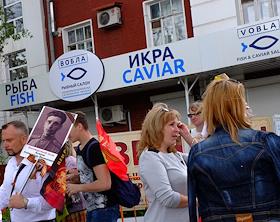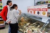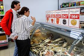 Жанровая фотография. Покупатели у прилавка магазина с рыбой и икрой.