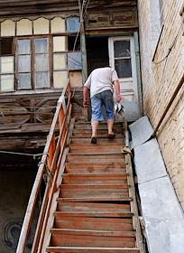 Жанровая фотография. Мужчина во дворе дома со связкой вяленой рыбы.
