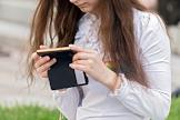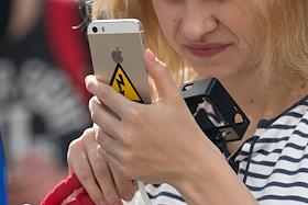 Жанровая фотография. Девушка читает с экрана смартфона Apple Iphone.