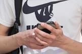 Жанровая фотография. Мужчина читает с экрана смартфона Apple Iphone.