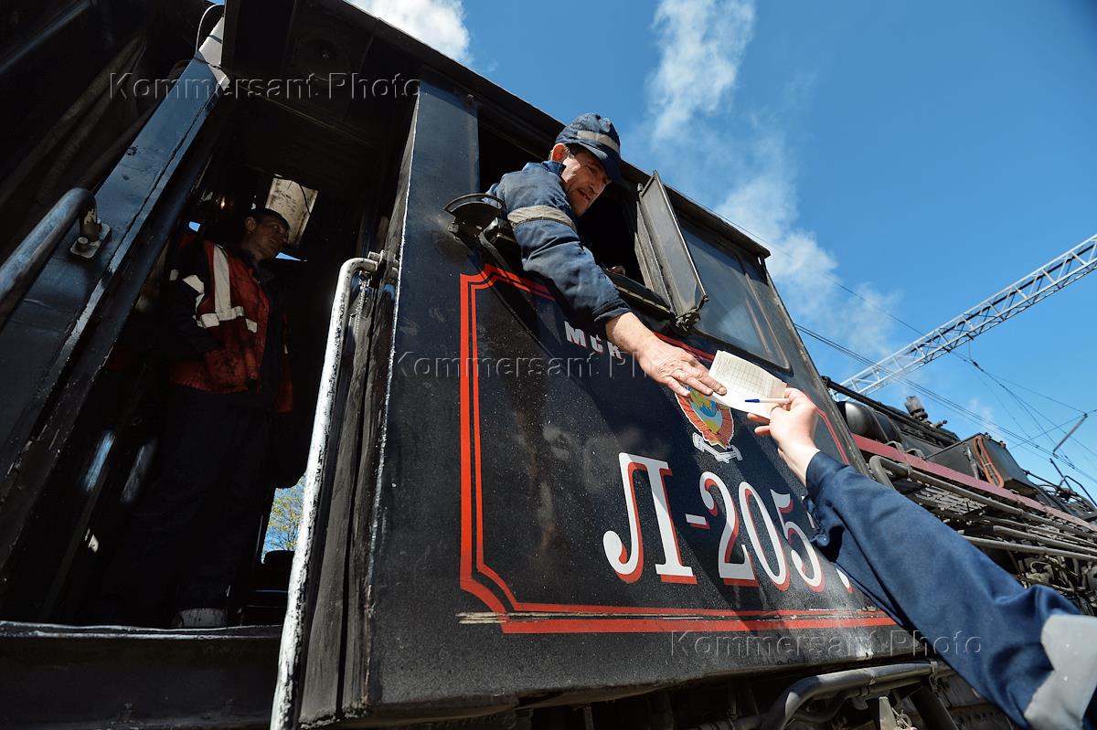 "Паровозная прогулка" на ретропоезде, организованная "РЖД-тур", от Рижского вокала до платформы Красный Балтиец. Дорожные рабочие во время осмотра паровоза.