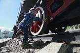 "Паровозная прогулка" на ретропоезде, организованная "РЖД-тур", от Рижского вокала до платформы Красный Балтиец. Дорожные рабочие во время осмотра паровоза.