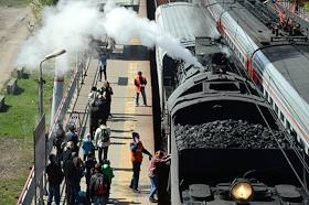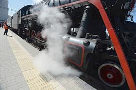 "Паровозная прогулка" на ретропоезде, организованная "РЖД-тур", от Рижского вокала до платформы Красный Балтиец. Паровоз, груженый углем выпускает пар перед отходом от перрона.