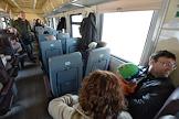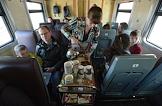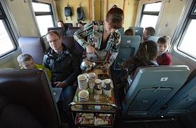 "Паровозная прогулка" на ретропоезде, организованная "РЖД-тур", от Рижского вокала до платформы Красный Балтиец. Пассажиры ретропоезда во время "Паровозной прогулки". Раздача чаи и кофе.