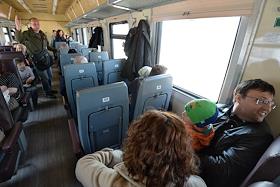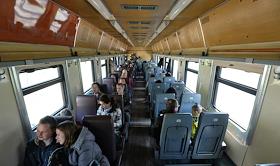 "Паровозная прогулка" на ретропоезде, организованная "РЖД-тур", от Рижского вокала до платформы Красный Балтиец. Пассажиры ретропоезда во время "Паровозной прогулки".