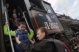 "Паровозная прогулка" на ретропоезде, организованная "РЖД-тур", от Рижского вокала до платформы Красный Балтиец. Дети во время осмотра паровоза.