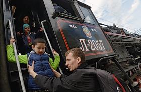 "Паровозная прогулка" на ретропоезде, организованная "РЖД-тур", от Рижского вокала до платформы Красный Балтиец. Пассажиры ретропоезда по окончании прогулки.