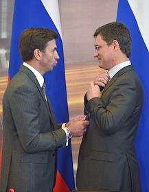 Рабочая поездка председателя правительства России Дмитрия Медведева в Санкт-Петербург. Министр России по вопросам Открытого правительства Михаил Абызов (слева) и министр энергетики России Александр Новак (справа) перед началом заседания Правительственной комиссии по импортозамещению.