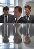 Рабочая поездка председателя правительства России Дмитрия Медведева в Санкт-Петербург. Слева направо: первый заместитель министра промышленности и торговли России Глеб Никитин, председатель правительства Дмитрий Медведев и министр энергетики России Александр Новак во время посещения ЗАО "Невский завод".