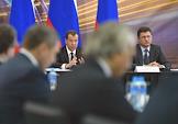 Рабочая поездка председателя правительства России Дмитрия Медведева в Санкт-Петербург. Председатель правительства России Дмитрий Медведев (слева) и министр энергетики России Александр Новак (справа) во время заседания правительственной комиссии по импортозамещению.