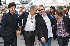 70-й Каннский международный кинофестиваль 2017 / Festival de Cannes 2017. Фотосессия съемочной группы фильма открытия "Призраки Исмаэля". Слева направо: актерs Луи Гаррель, Ипполит Жирардо, режиссер Арно Деплешен, актер Матьё Амальрик во время фотосессии.