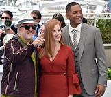 70-й Каннский международный кинофестиваль 2017. Слева направо: председатель жюри - режиссер Педро Альмадовар, члены жюри американские актеры Джессика Честейн и Уилл Смит во время фотосессии перед Дворцом фестивалей и конгрессов.
