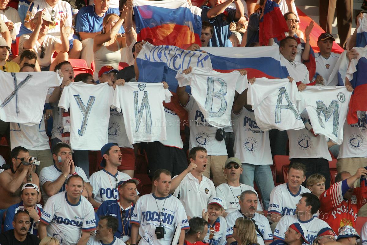 Чемпионат Европы по футболу "EURO - 2004". Трибуна болельщиков России во время матча сборной России и Португалии. Российские болельщики держат плакат с надписью.