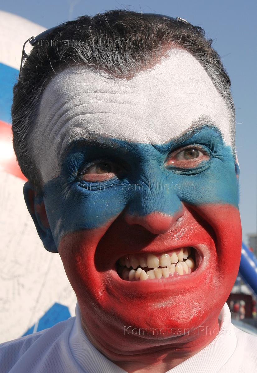 Чемпионат Европы по футболу "EURO - 2004". Болельщик сборной России с раскрашенным лицом на трибуне во время матча нашей команды.
