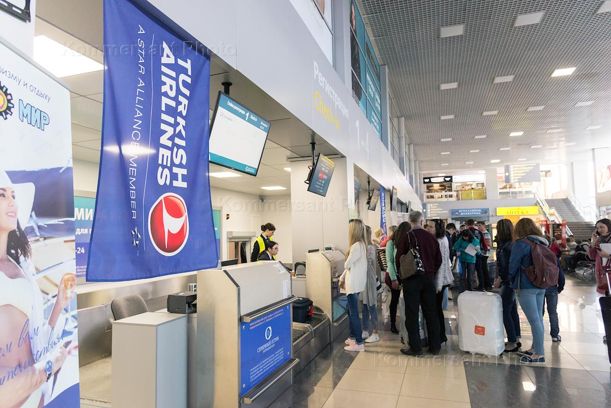 Жанровая фотография. Пассажиры проходят регистрацию на рейс авиакомпании "Вим-авиа" в Анталию (Турция). Флаг авиакомпании Turkish Airlines.