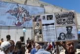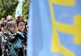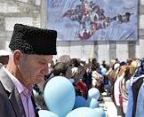 Мероприятия, посвященные Дню памяти жертв депортации крымских народов на месте строительства мемориального комплекса жертвам депортации на железнодорожной станции "Сирень". Значки с символикой крымских татар.