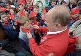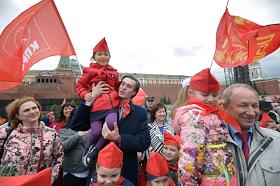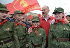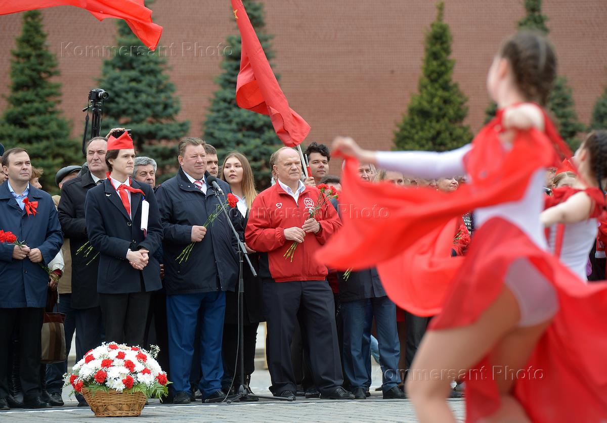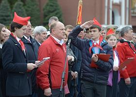 Лидер КПРФ, член комитета Государственной думы по делам Содружества Независимых Государств, евразийской интеграции и связям с соотечественниками Геннадий Зюганов (в центре) во время торжественного приема в пионеры на Красной площади.