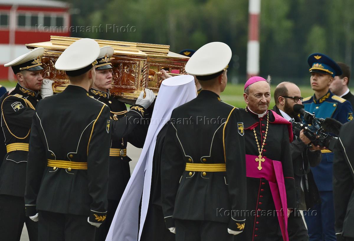 Встреча мощей святителя Николая Чудотворца в аэропорту "Внуково-3". Викарий Патриарха Московского и всея Руси Илларион (в центре) и архиепископ Бари Франческо Какуччи (третий справа) во время вноса ковчега в здание аэропорта.