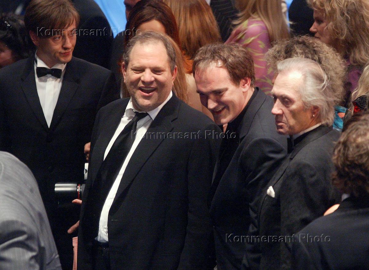 XXVI Московский международный кинофестиваль (ММКФ). Церемония открытия в киноконцертном зале "Пушкинский". Слева направо: актер Сергей Безруков, продюсер Харви Вайнштейн, режиссер Квентин Тарантино и актер Дэвид Кэррадайн на церемонии.