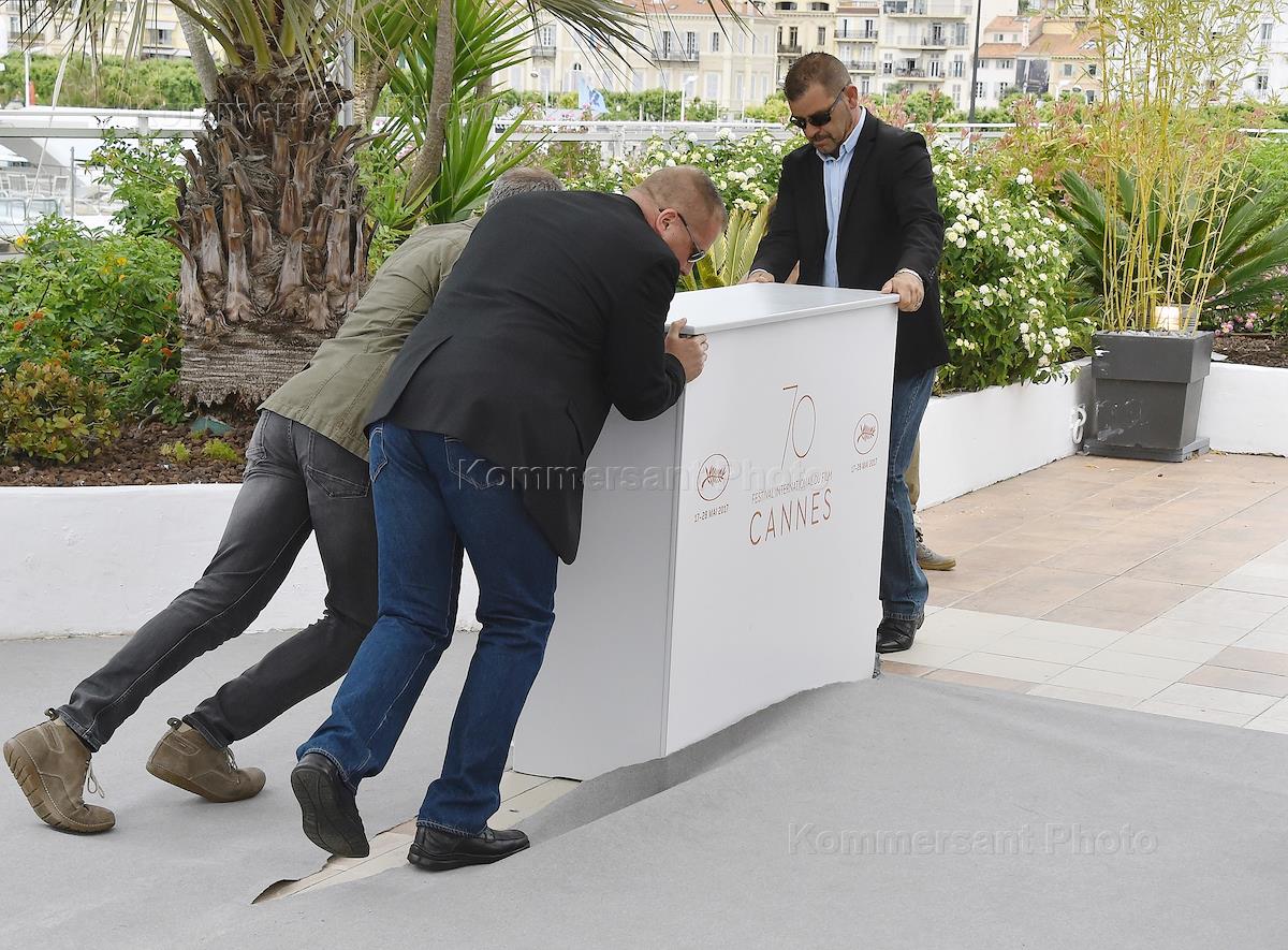 70-й Каннский международный кинофестиваль 2017 / Festival de Cannes 2017. День шестой. Жанровая фотография. Подготовка декорации для фотосессий участников съемочных групп фильмов кинофестиваля.