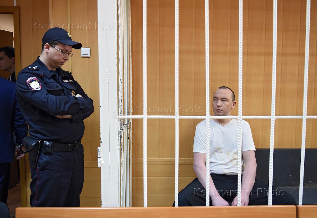 Рассмотрение по существу дела Александра Шпакова, обвиняемого в нападении на полицейского на несанкционированной акции 26 марта в Москве, прошло в Тверском районном суде. Обвиняемый Александр Шпаков (в центре) во время заседания суда.