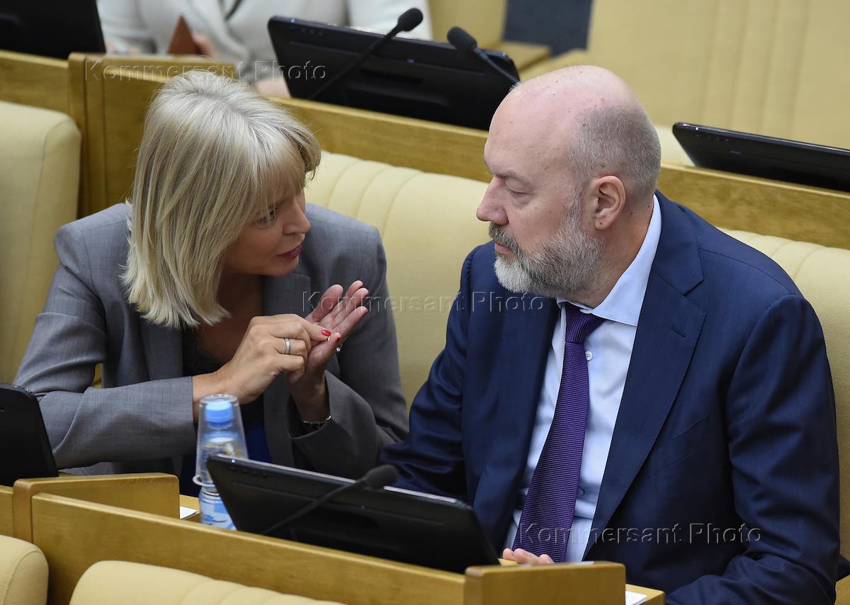 Пленарное заседание Государственной думы (ГД) России. Член комитета ГД России по охране здоровья Николай Герасименко (слева) и член комитета ГД России по государственному строительству и законодательству Ольга Баталина (справа) во время заседания.