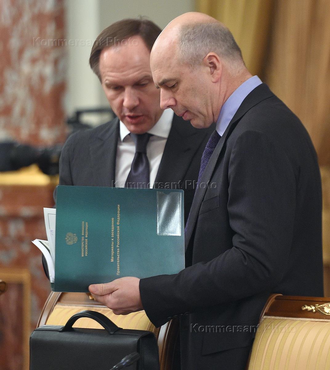 Заседание правительства России. Министр по делам Северного Кавказа Лев Кузнецов (слева) и министр финансов России Антон Силуанов (справа) перед началом заседания.