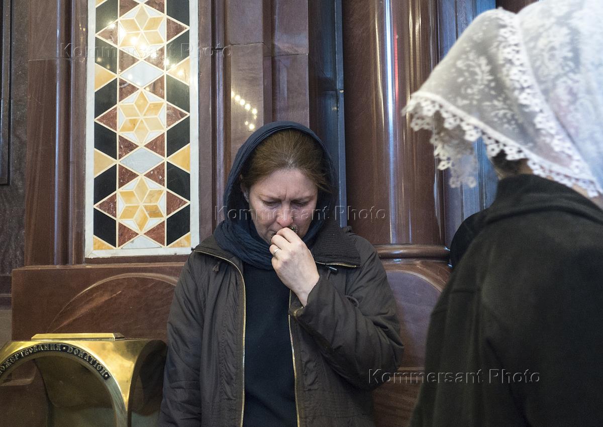 Верующие в очереди на поклонение к мощам святителя Николая Чудотворца в храме Христа Спасителя. Женщина молится в церкви.