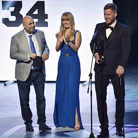Торжественная церемония закрытия IX сезона континентальной хоккейной лиги (КХЛ) в концертном зале Barvikha Luxury Village. Слева направо: продюсер Иосиф Пригожин, певица Валерия и хоккеист ХК "СКА" (Санкт-Петербург) Антон Белов во время церемонии.