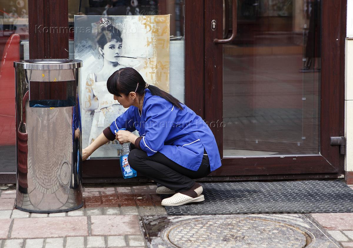 Жанровая фотография. Девушка моет витрину магазина.