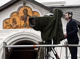 Торжественная церемония освящения нового храма Воскресения Христова и Новомучеников и Исповедников Церкви Русской московского Сретенского монастыря. Телеоператор с камерой во время церемонии.